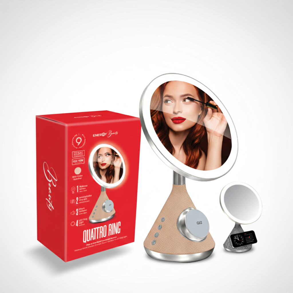 שדרגי את שגרת הטיפוח שלך עם ה-Quattro Ring, המראה שמשנה את חוקי המשחק. עיצוב ה-Sand היוקרתי משתלב מושלם על שולחן האיפור ונותן תחושה של סטודיו מקצועי.
